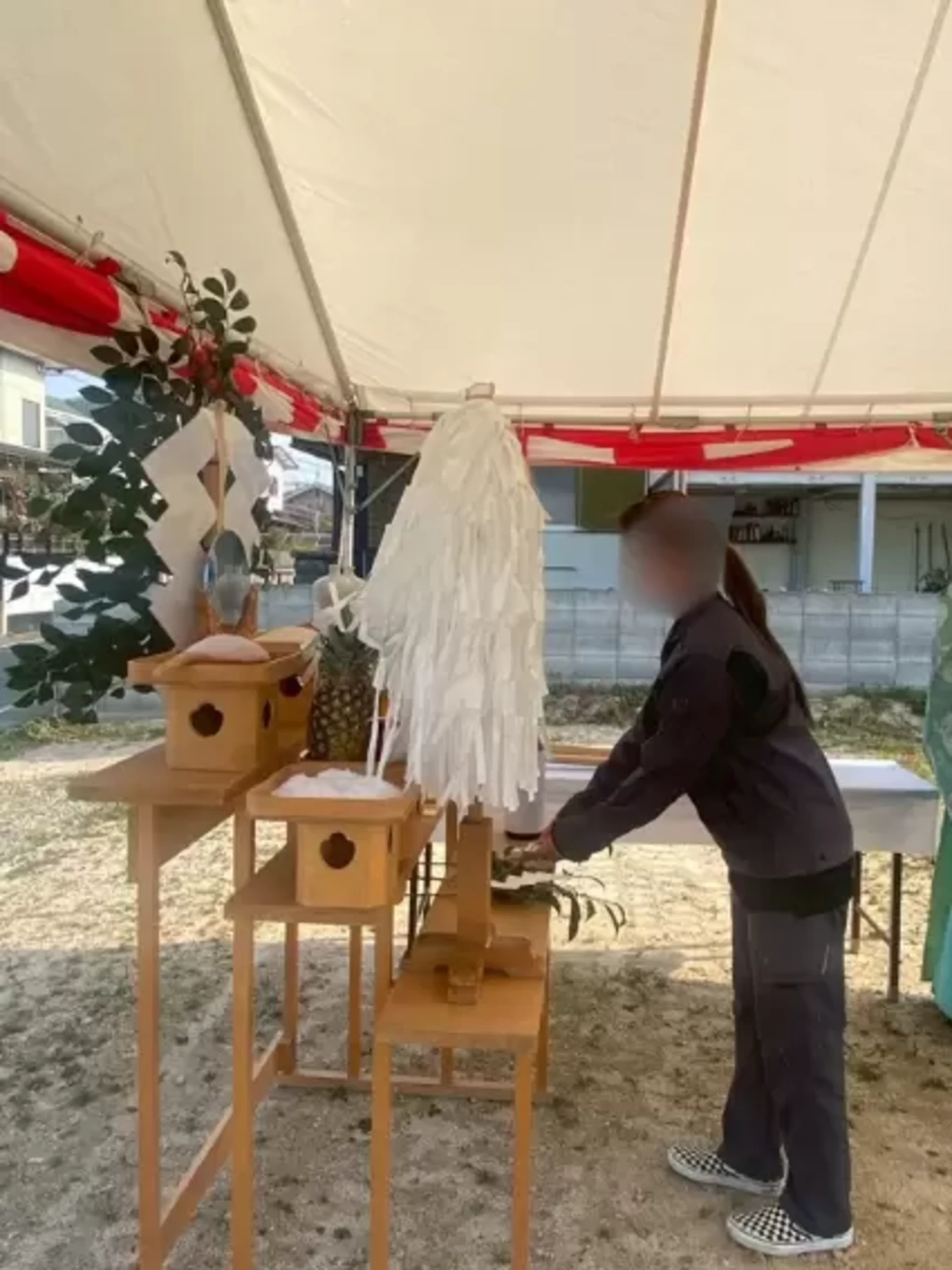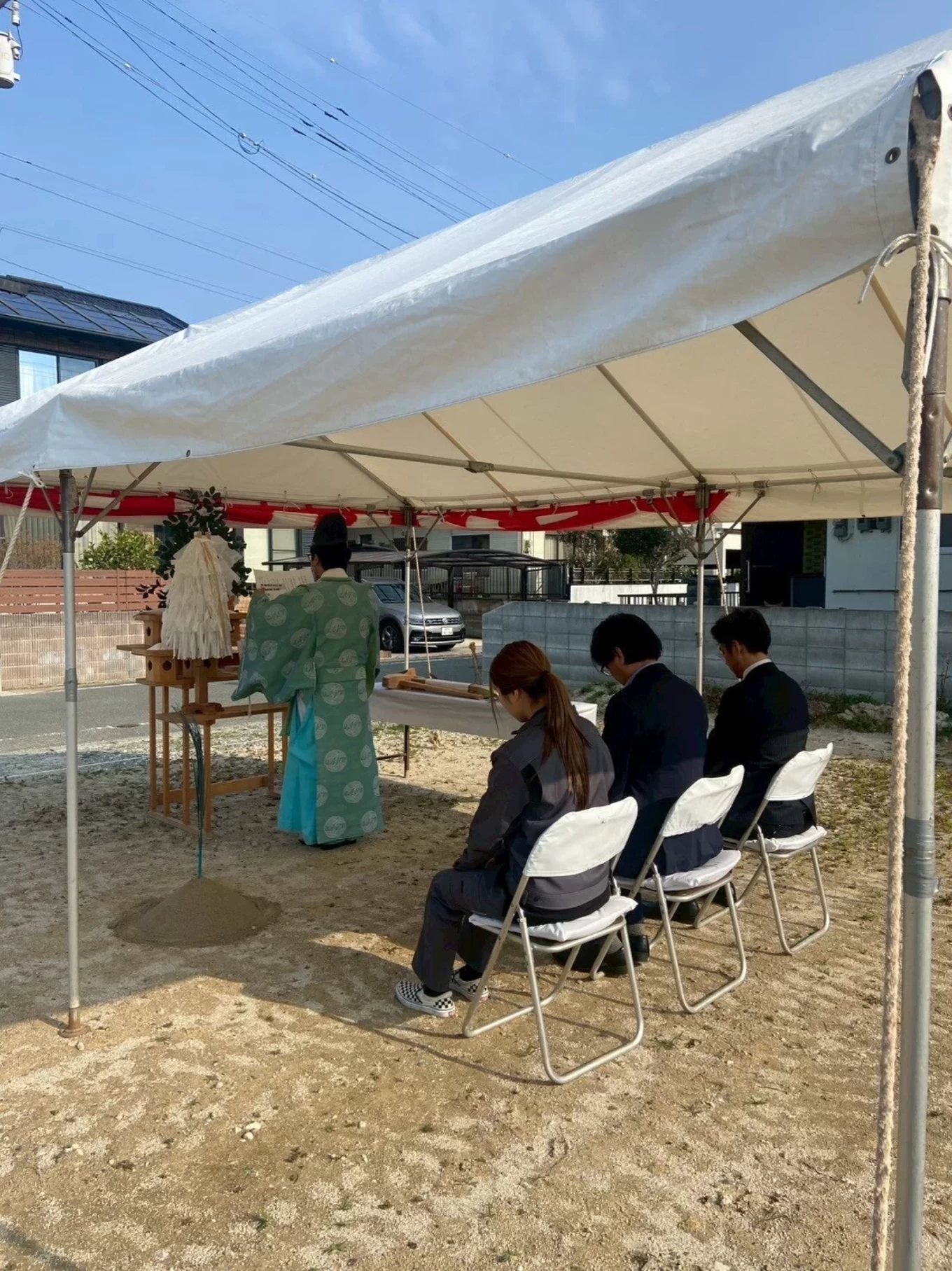 神主様をお招きし、土地をお清めしながらこれから始まる工事の安全を祈願します。