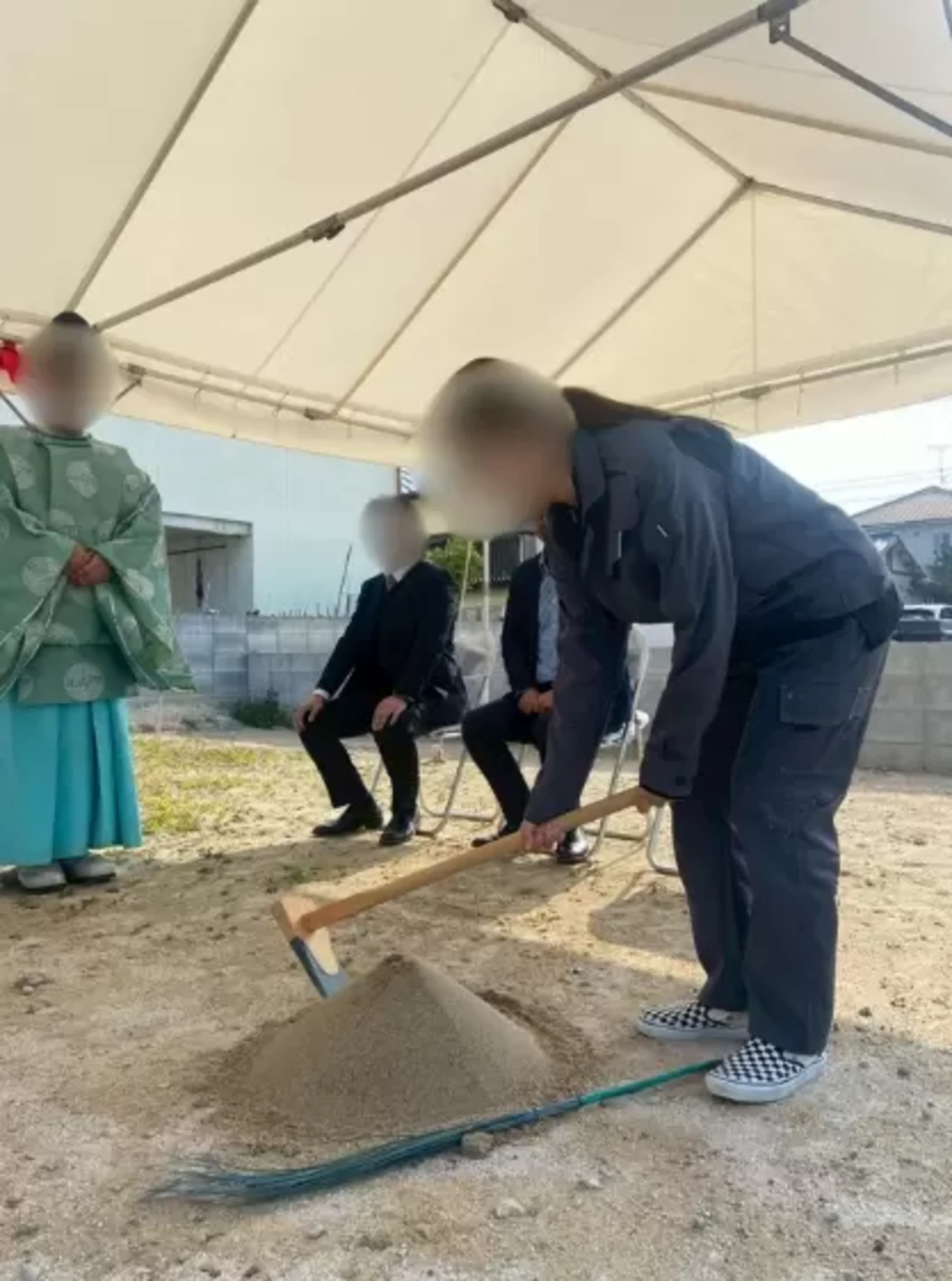 鍬を使って盛り砂に鍬を入れる動作を行い、いよいよ工事が始まることを象徴する場面でもあります。