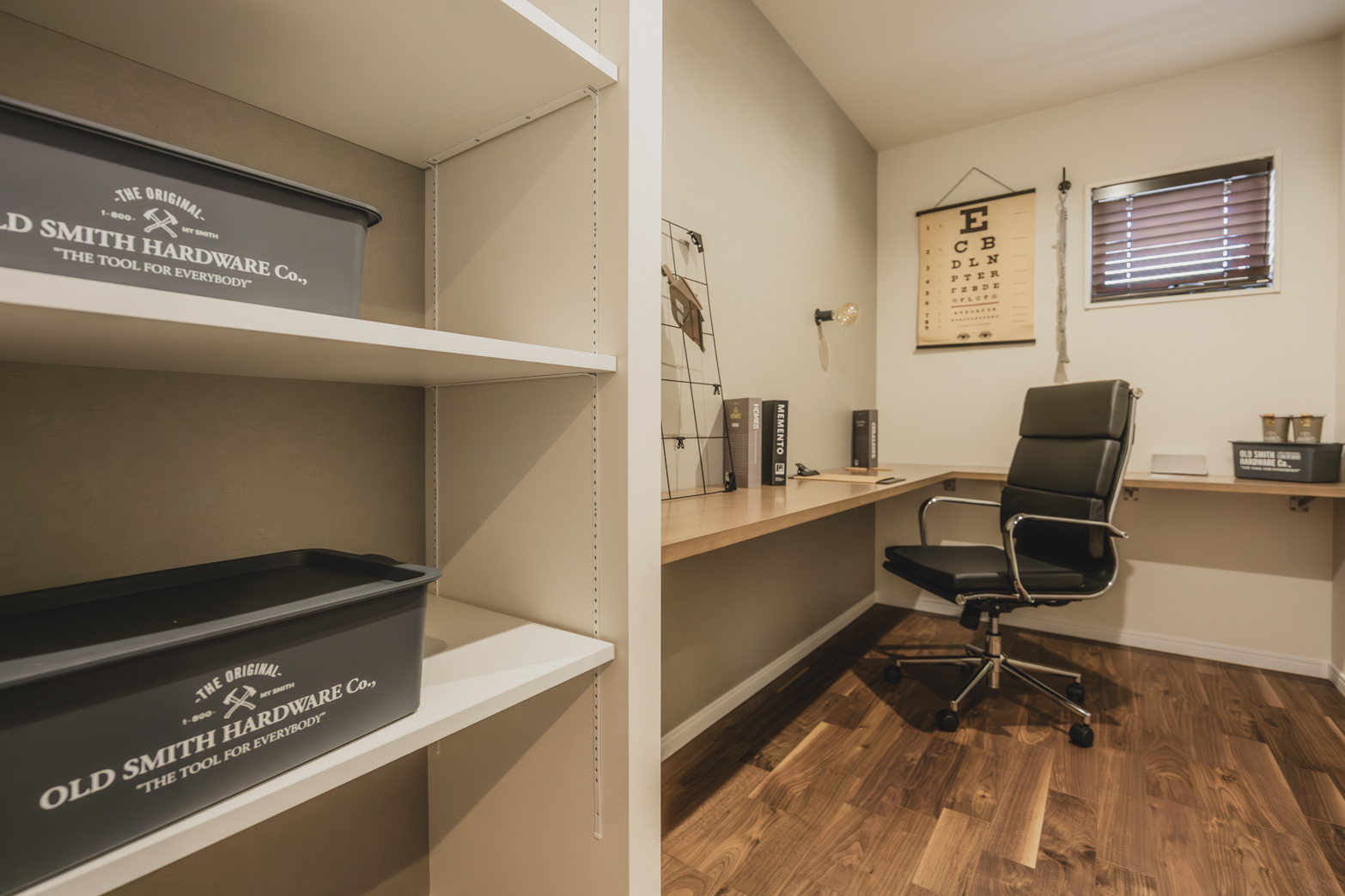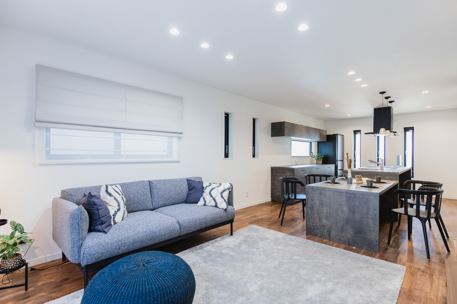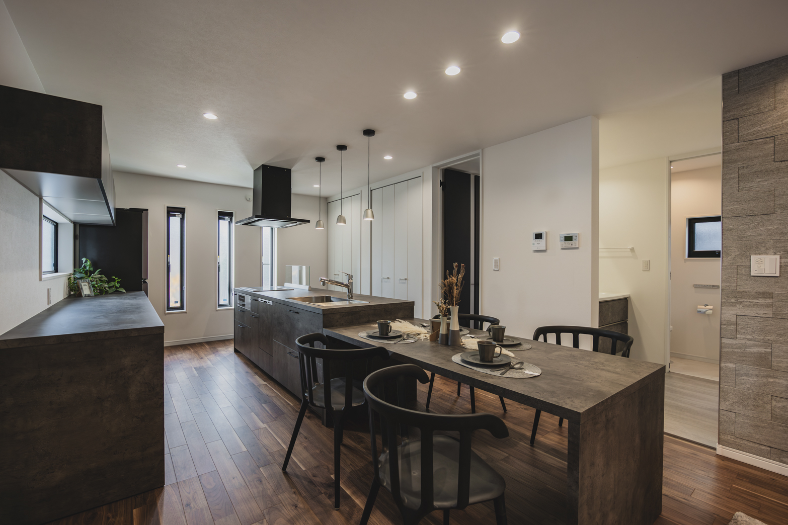 GRAFTEKT社のアイランドキッチンには収納が多くあり利便性が高いのも嬉しいポイントです。また水回り動線をゆったり取った間取りで暮らしやすい間取りです。書斎は4.0帖あるのでご家族でも共用で使えます。モノクロでスタイリッシュなデザインがお好きな方におすすめの一例です。