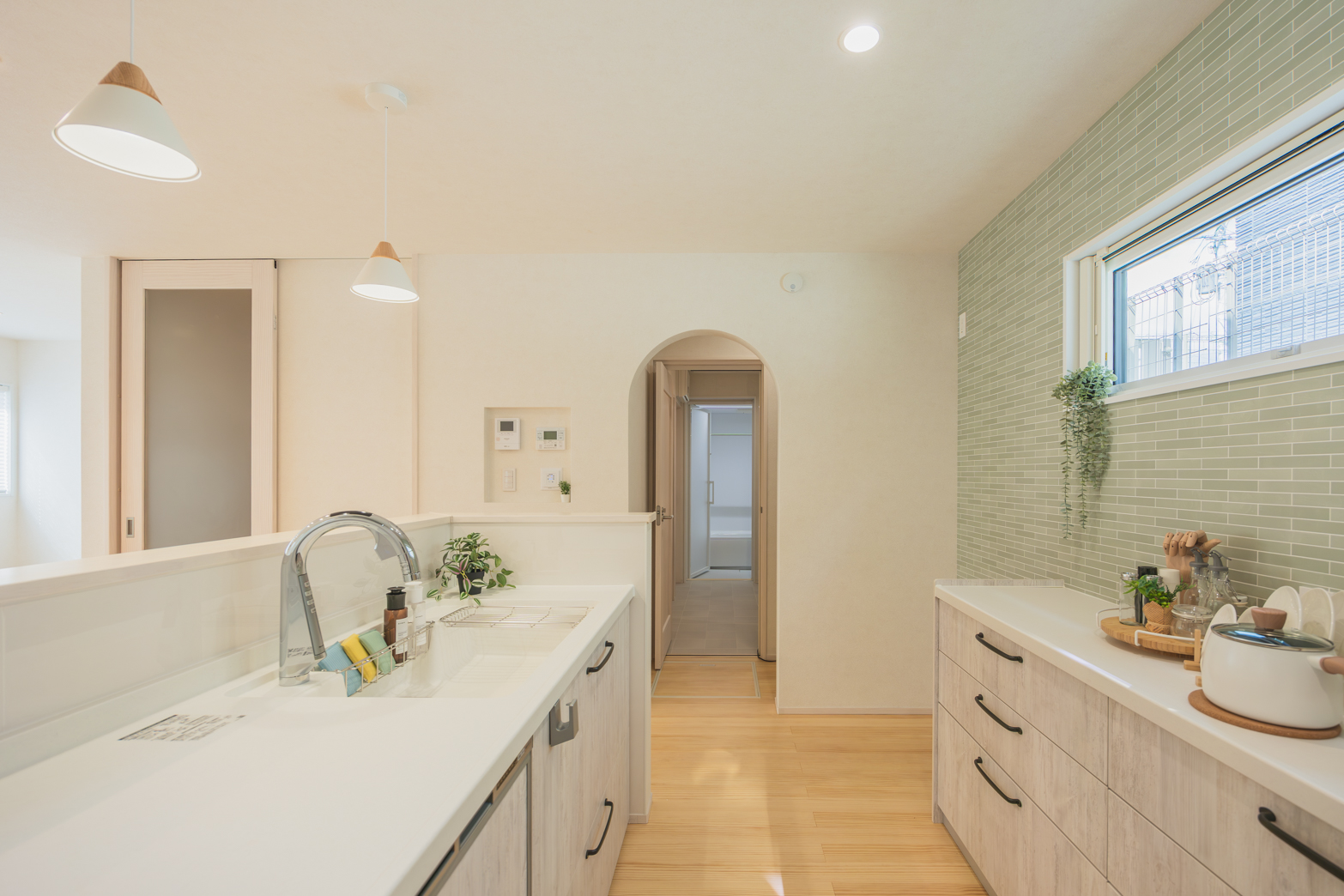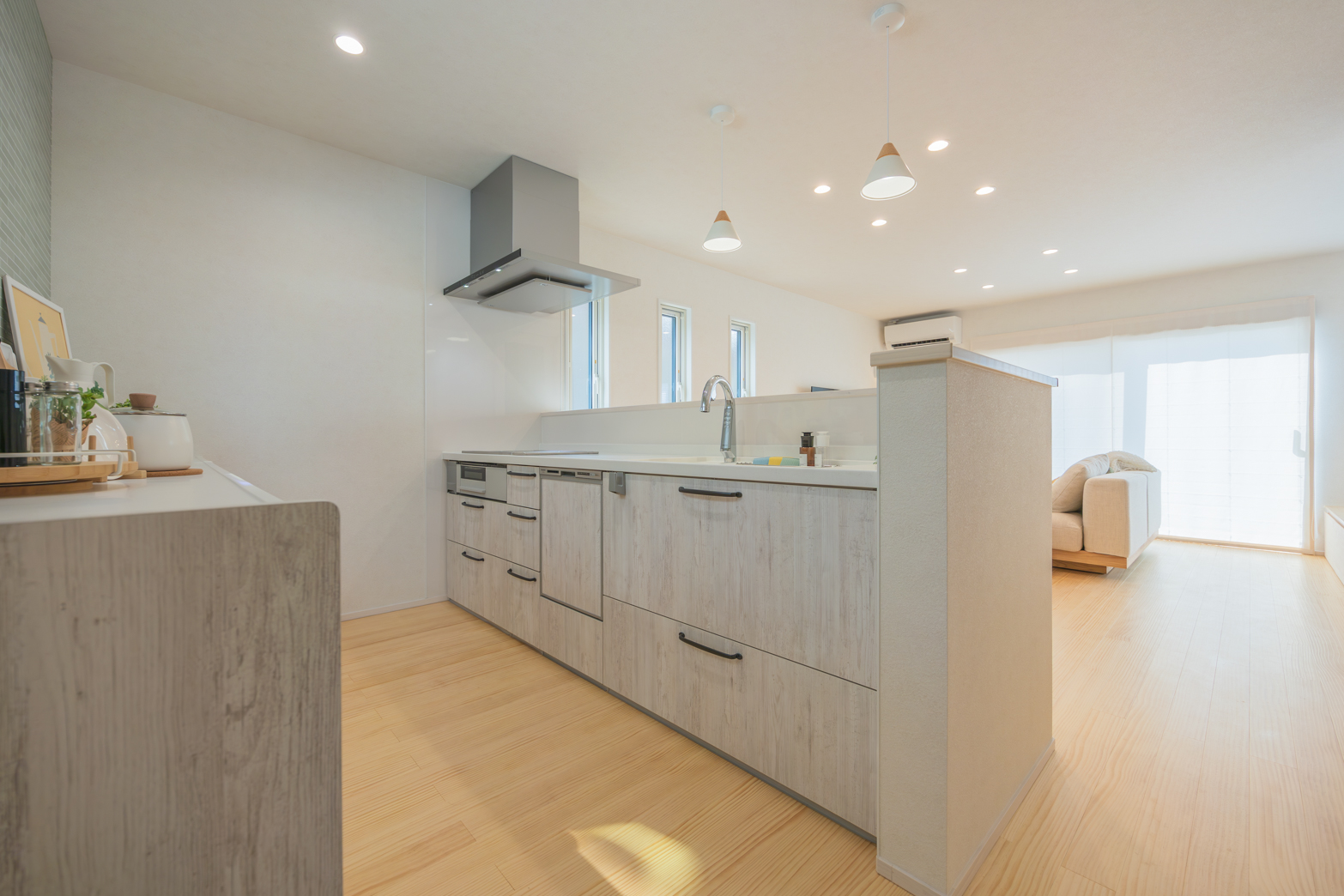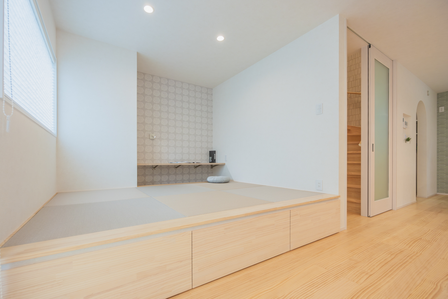 グレー×ブラックでスタイリッシュな外観。並んで使える造作洗面台は使いやすく、小上がりの畳スペースが家族の憩いの場所になります。