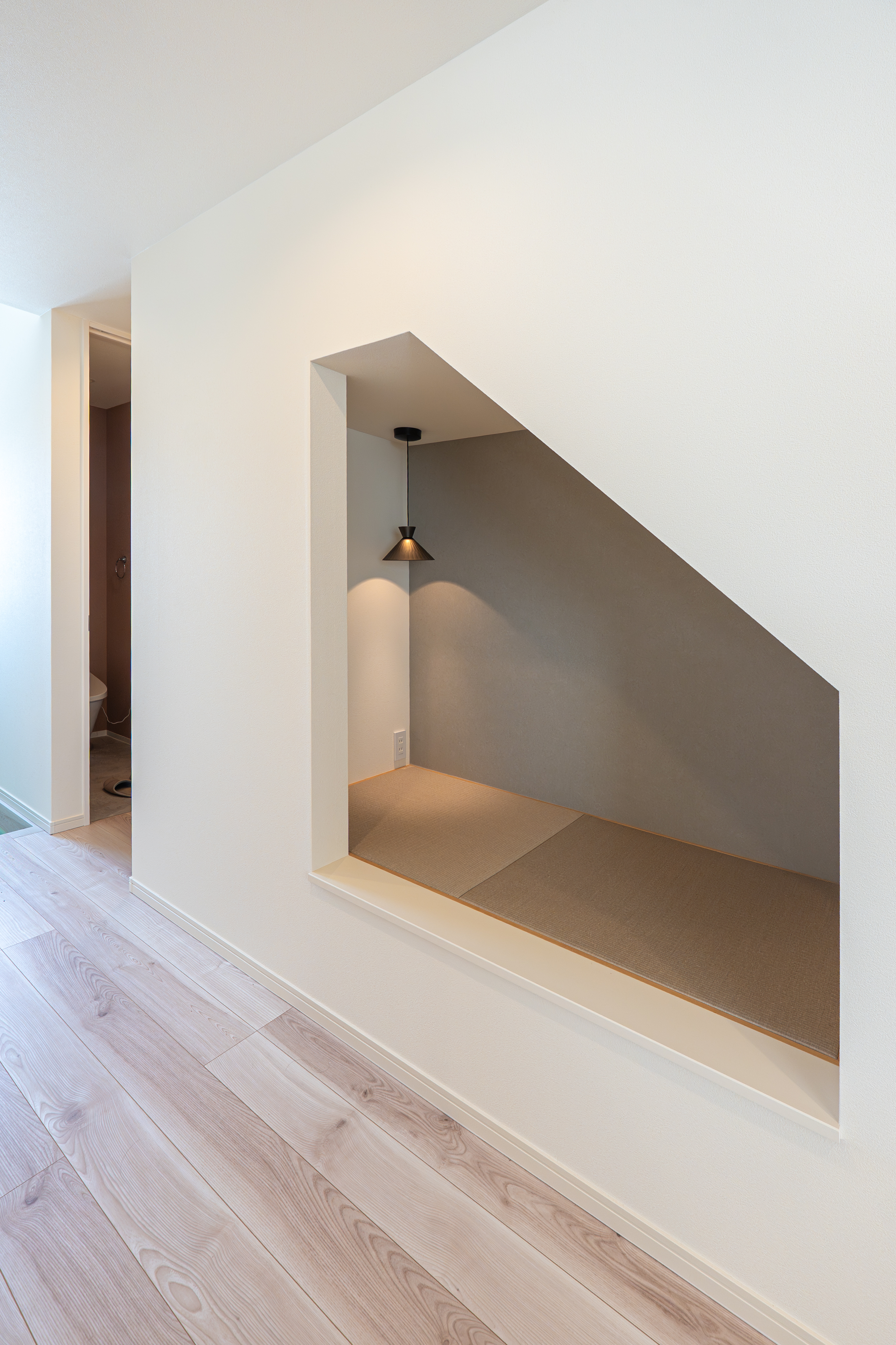 LDKの一角にしつらえた小上がりのヌックは、日々の忙しさから少しだけ離れ、ほっとひと息ついていただける特別な空間です。あえて適度に囲われたコンパクトな設計にすることで、包み込まれるような深い安らぎを演出いたしました。家事の合間のリフレッシュはもちろん、読書や映画鑑賞など、ご自身の趣味に没頭する豊かな時間をお過ごしいただけます。